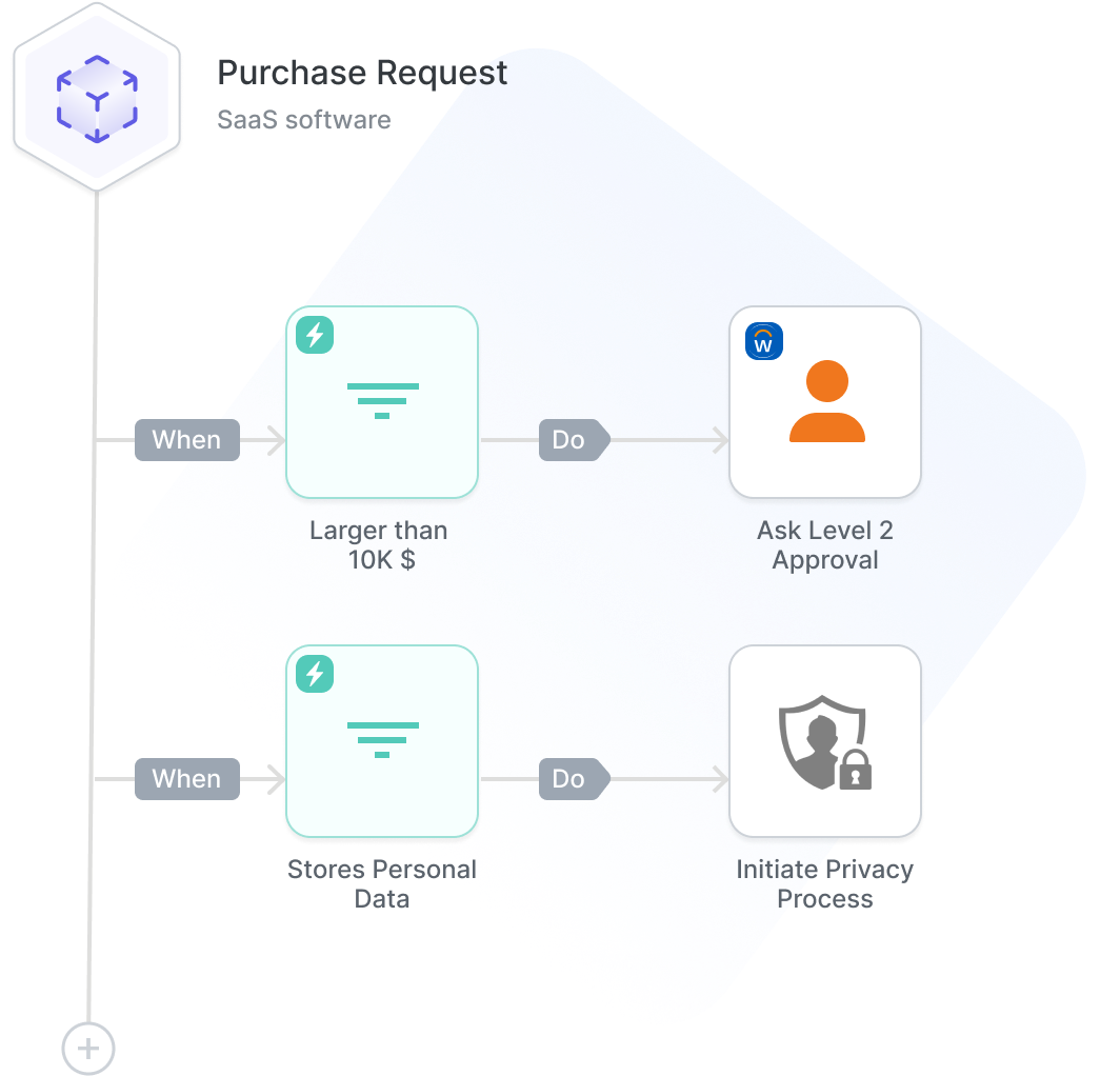 Easily create complex business logic that intakes and routes business requests; handles triage, escalation, and exception flow; and enforces compliance with policies from legal, procurement, finance, and security.